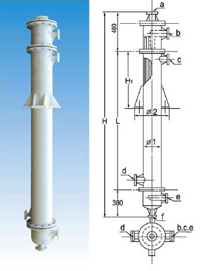a.氣體入口 d.冷卻水進口 上部:內有鋸齒形溢流分布裝置。
