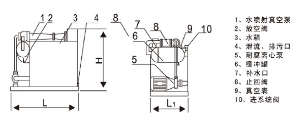 1、蒸汽真空泵 2、水噴射真空閥 3、放空閥 4、水箱 5、泄流、排污口 6、耐腐離心泵 7、緩沖罐 8、補水口 9、系統連接閥
